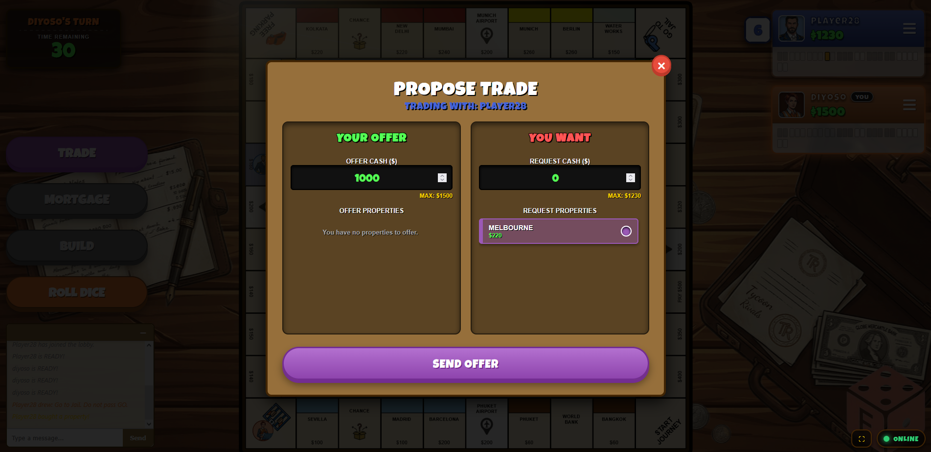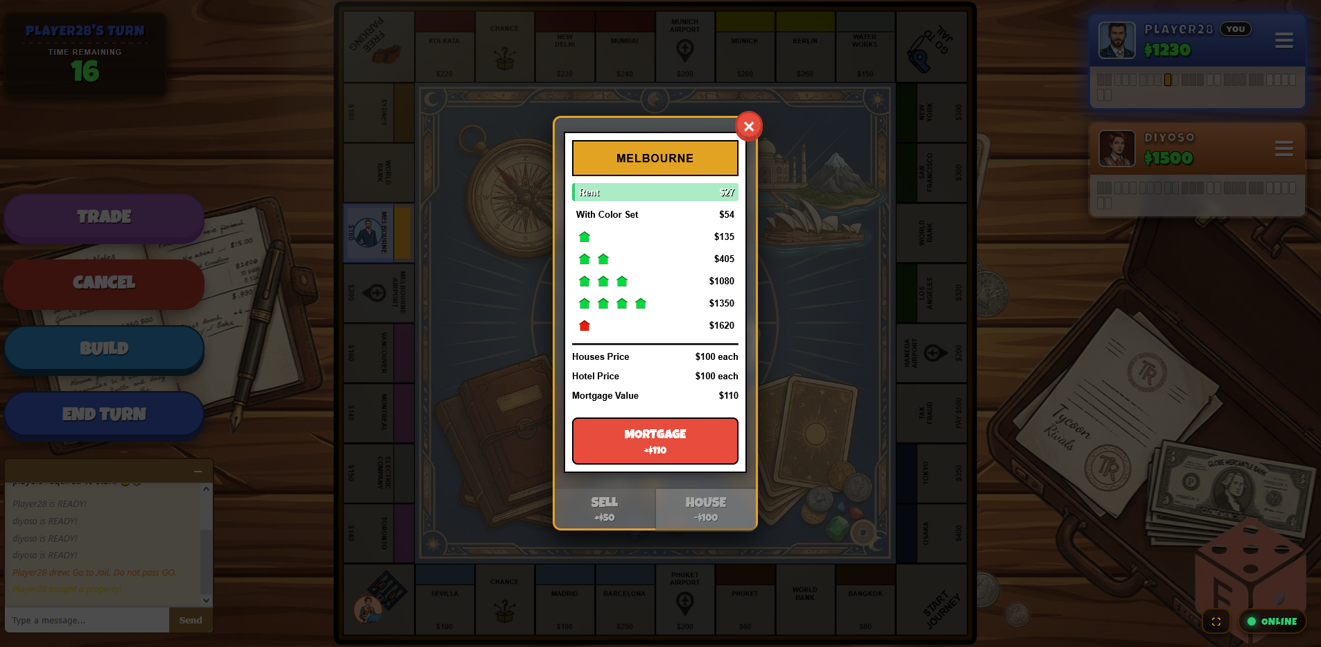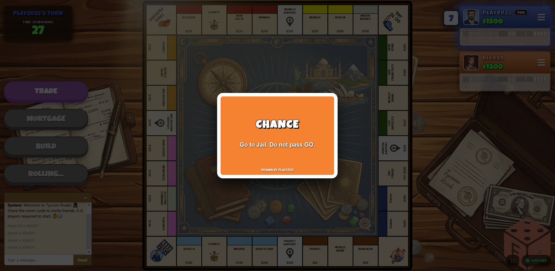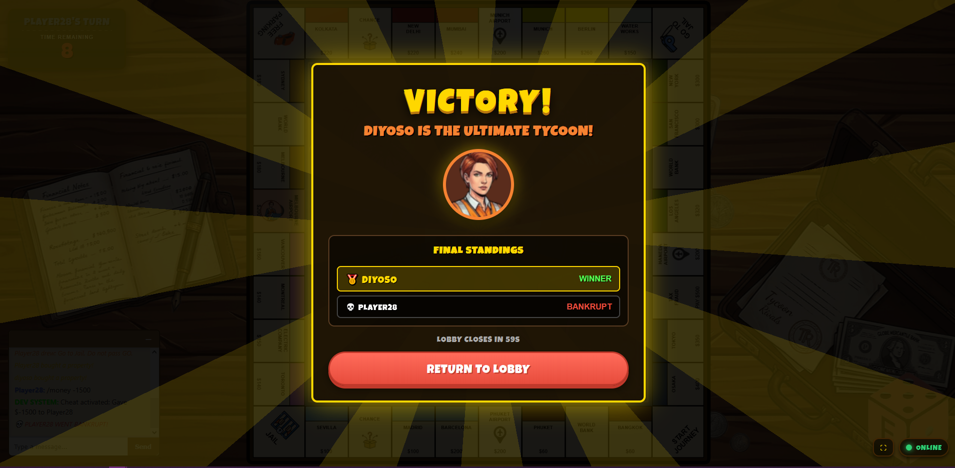 Tycoon Rivals takes the classic property-trading formula and injects it with real-time urgency. Say goodbye to three-hour stalemates and waiting for slow players to take their turn. Built for the modern web, our authoritative server clock keeps the action moving—if a player falls asleep at the keyboard, the server automatically rolls for them or skips their turn!
